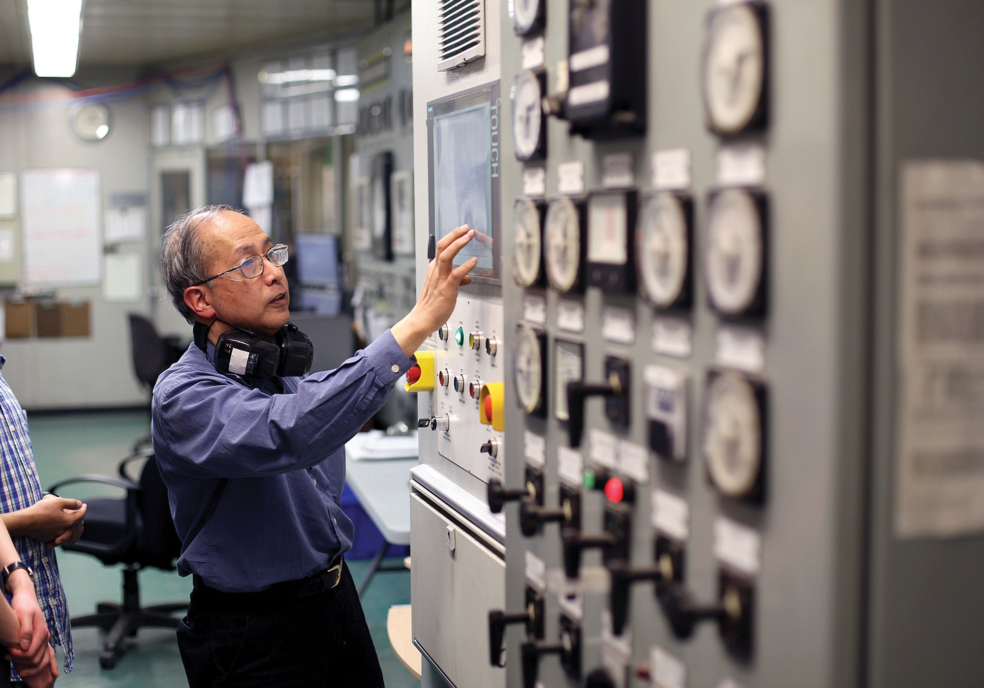 Boon Teak Lee, U of T's former chief engineer at the university's central steam plant, explains its operations on a student tour. Steam is delivered to many buildings across campus for heating spaces and making hot water. (Photo by Jon Horvatin)