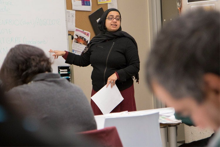 Noreen Ahmed-Ullah teaches students how to structure and craft a news story (photo by Romi Levine)
