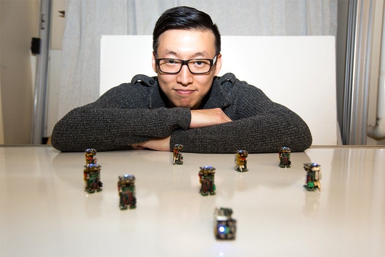 Engineering PhD student Justin Kim has built nine robots not much larger than a thumb that exhibit “swarm intelligence.” (photo by John Guatto)