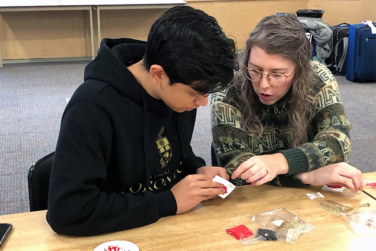 Alexander Gomez Sanchez works with Jenna Lemay, a Shingwauk Residential School Centre digital archives technician (photo by Reid Locklin)