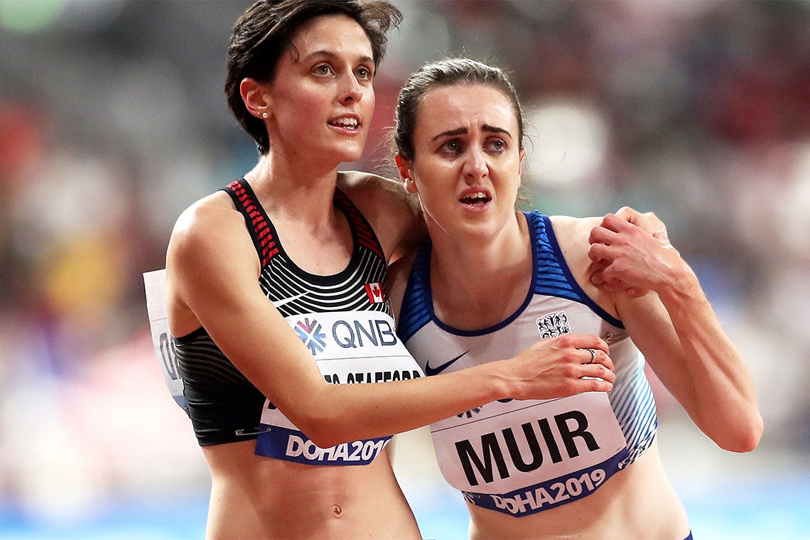 Canada's Gabriela Debues-Stafford (left) and Great Britain's Laura Muir after the 1,500 metre women's final at the IAAF World Championships in Doha, Qatar (photo by Martin Rickett/PA Images via Getty Images)