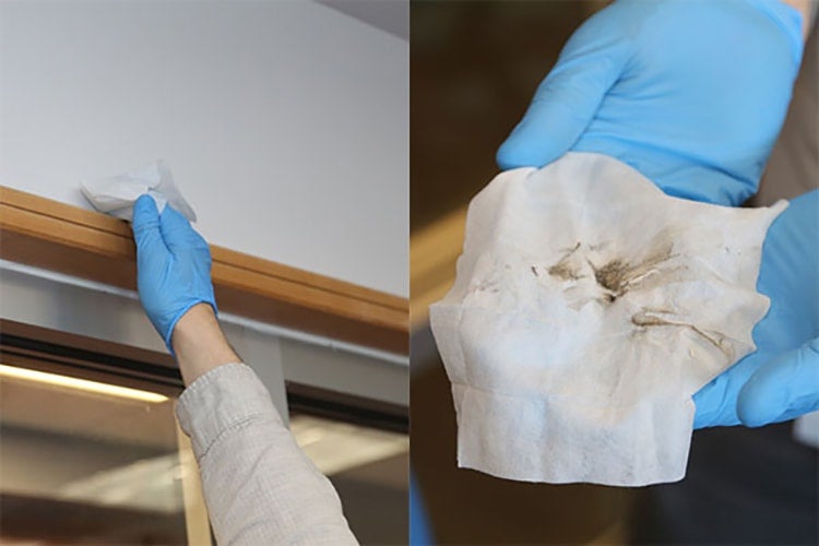 Dust collected using a wet, disposable cloth can be tested in the lab to see if it contains evidence of fire ash and/or elevated levels of toxic substances (photo by Tyler Irving)