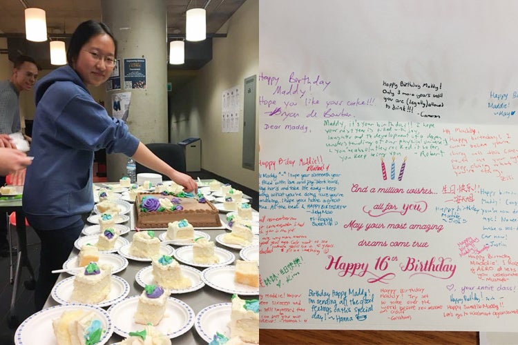 When Zhang’s 16th birthday finally rolled around, Lau planned to make the event one Zhang would remember. After a workshop, a weary Zhang headed back to the engineering science students’ common room. When the lights flicked on she saw she was surrounded by friends and two Costco sheet cakes – one vanilla, one chocolate – set out on a long table.