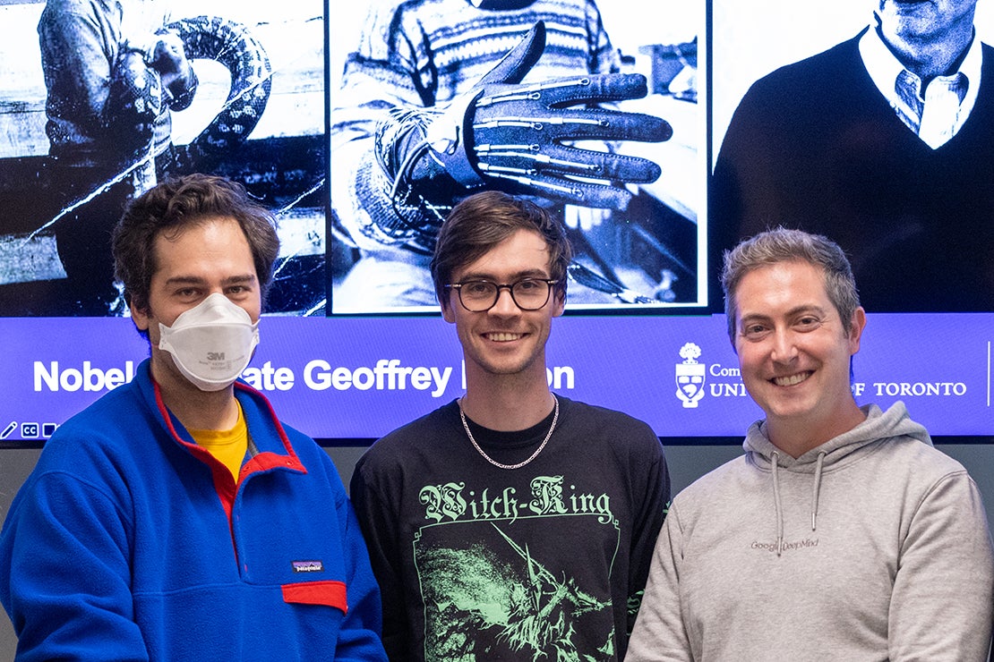 From left: Chris Maddison, Nick Frosst and Kevin Swersky at a recent event celebrating U of T University Professor Emeritus Geoffrey Hinton's 2024 Nobel Prize in Physics (photo by Johnny Guatto)