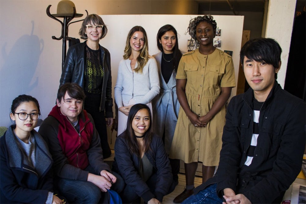Ann MacDonald, executive director and chief curator of the Doris McCarthy Gallery (standing, far left), took students to the studio of Anique Jordan (standing, far right) when the class was considering Jordan's work for the Doris McCarthy Gallery’s permanent collection.
