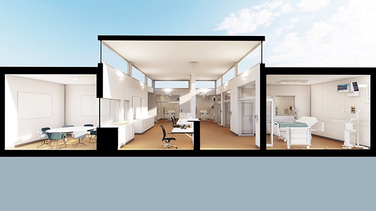 Farrow was inspired to improve on other temporary hospital solutions he’d seen on the news. “The environments we build to support our medical staff and patients need to be the meal equivalent to a fruit-, vegetable- and protein-enhanced energy drink smoothie,” he says, “giving you mental energy and clarity, physical strength and resiliency and mind comfort; an accelerant that will help you succeed under stressed conditions.”