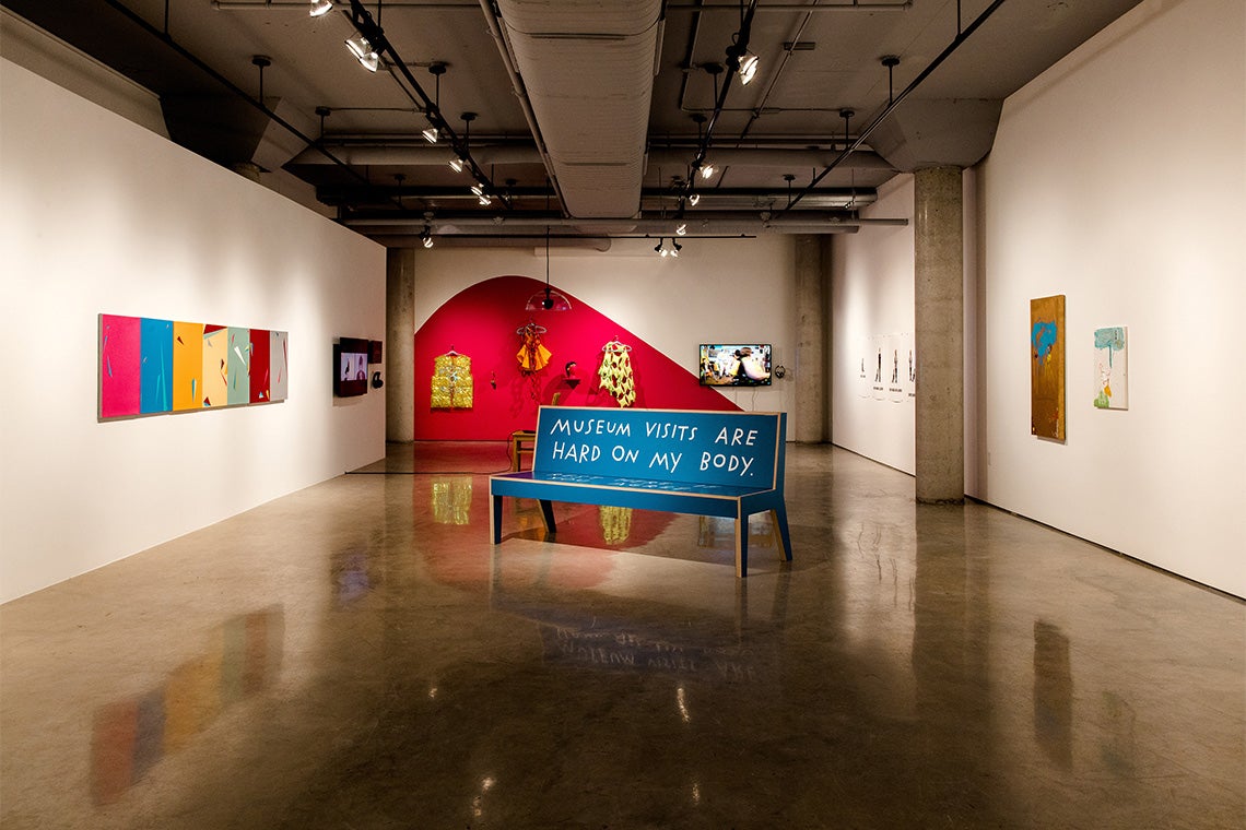 Those rituals fall into four categories: self-care, creating access, art-making and protest. Amid the exhibit, a bright blue bench reads “MUSEUM VISITS ARE HARD ON MY BODY,” highlighting ableism in art spaces without places to sit. One piece looks at how the Quran views disability while another examines living with mental illness as an Indigenous community member.