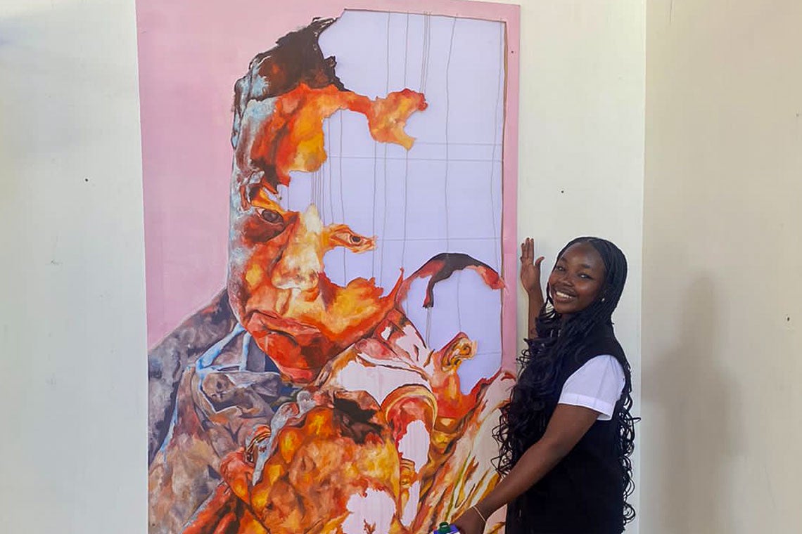 Paris Ouma, pictured here with her artwork, is beginning her studies at U of T Mississauga this fall with the support of the university’s Lester B. Pearson International Scholarship (all images courtesy of Paris Ouma)