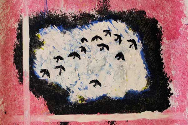 Question, a painting by Freya Gandhi from U of T Mississauga, places a bold question mark in the middle of a flurry of colours.