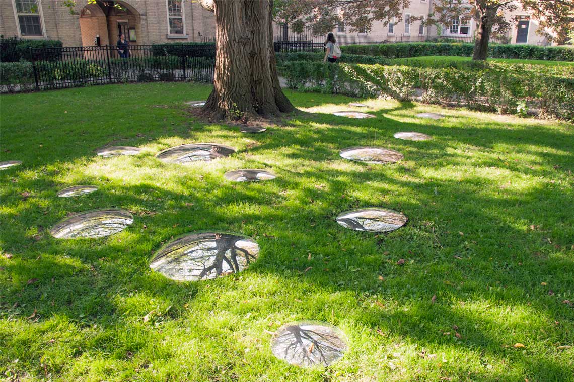 Sprinkled around the leafy green space next to University College are 130 curved convex mirrors forming a giant circle on the ground. Each orb provides a unique perspective – forcing viewers to look up by looking down.