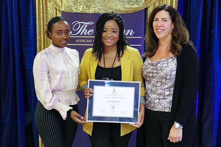 Mariam Olafuyi (centre) receives her award from Iris Hategekimana, an African Alumni Association volunteer, and Kelly Hannah-Moffat (photo by Perry King)