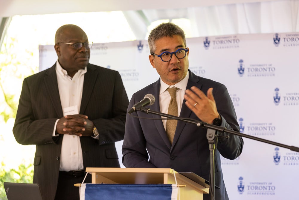 Professor Ernest Aryeetey, secretary general of the Africa Research Universities Alliance, looks on as Professor Joseph Wong, U of T’s vice-president, international, addresses attendees at a summit held at U of T in 2022 (photo by Ruilin Yuan)