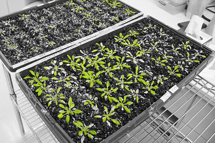Specimens of Arabidopsis thaliana plants: healthy and bacteria-resistant (green), infected and susceptible to disease (grey). Researchers infected healthy specimens and measured abilities to fend off pathogen attacks (photo by Bradley Laflamme)