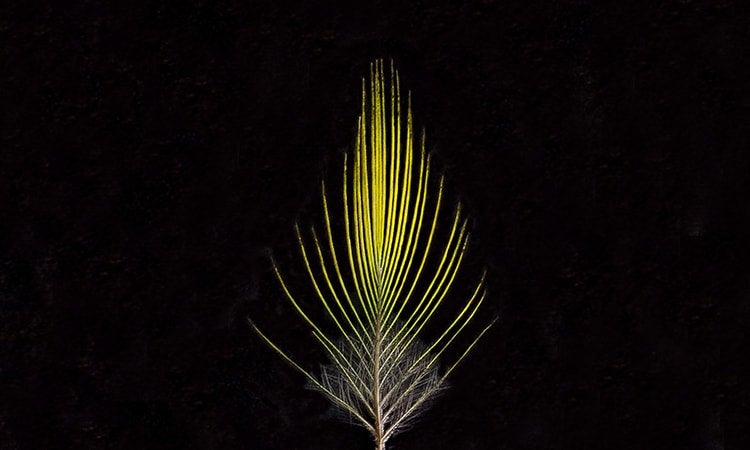 A single crown feather from a golden-crowned manakin, which U of T researchers discovered to be a rare hybrid species (photo by Don Campbell)