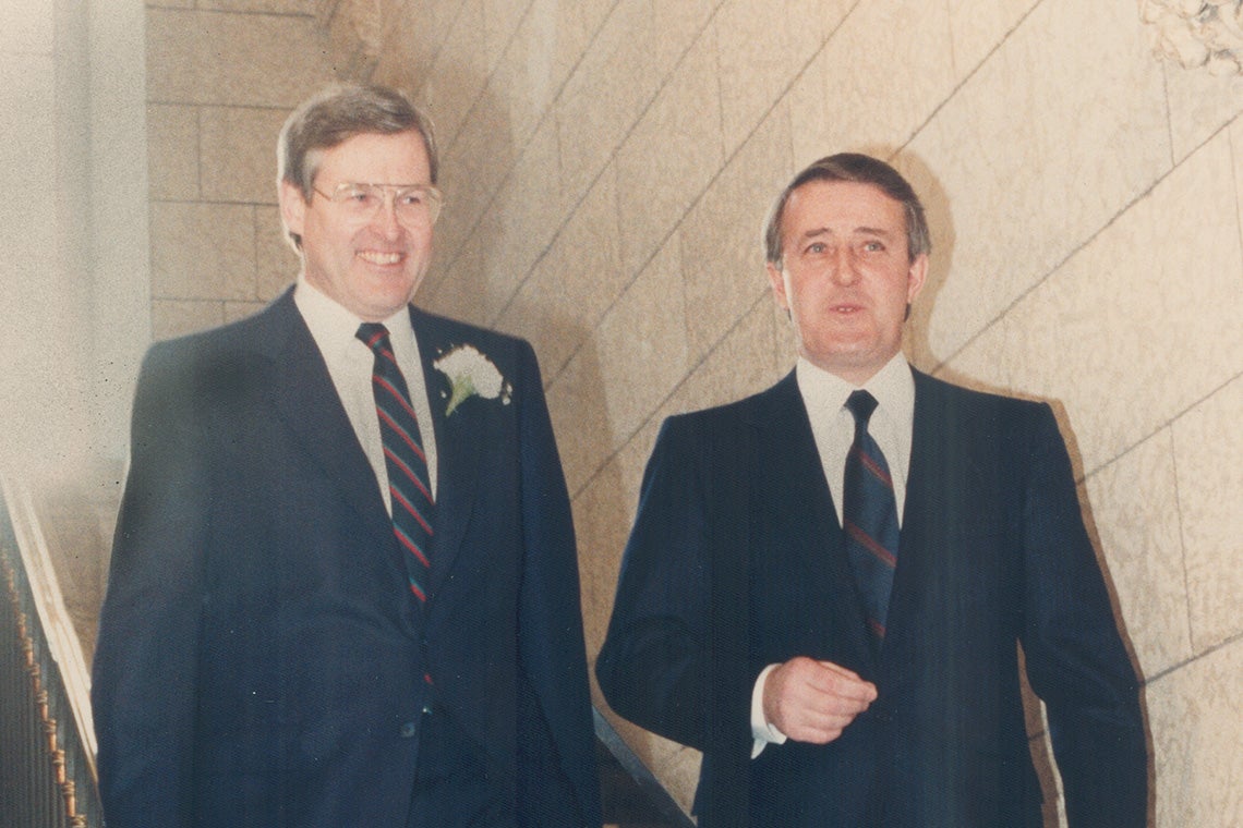 Prime Minister Brian Mulroney, right, accompanies Finance Minister Michael Wilson on the way to the House of Commons on Feb. 26, 1986 (photo by Boris Spremo/Toronto Star via Getty Images)