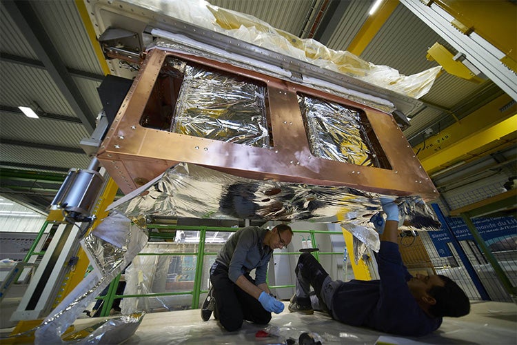 The assembly of the crab cavity housing, a cryostat that will serve as a high-performance coldbox, keeping the cavities at their operating temperature (photo by Maximilien Brice/CERN)