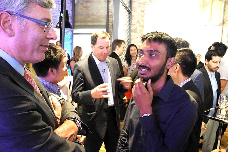 U of T researcher Varun Perumal chats with David McKay, RBC's chief executive, at MaRS (photo by Chris Sorensen)