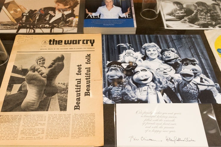 A note from Dick Clark (left), photographs, LPs and videos are among the more than 70 boxes in the Anne Murray archives at U of T Libraries' Media Commons
