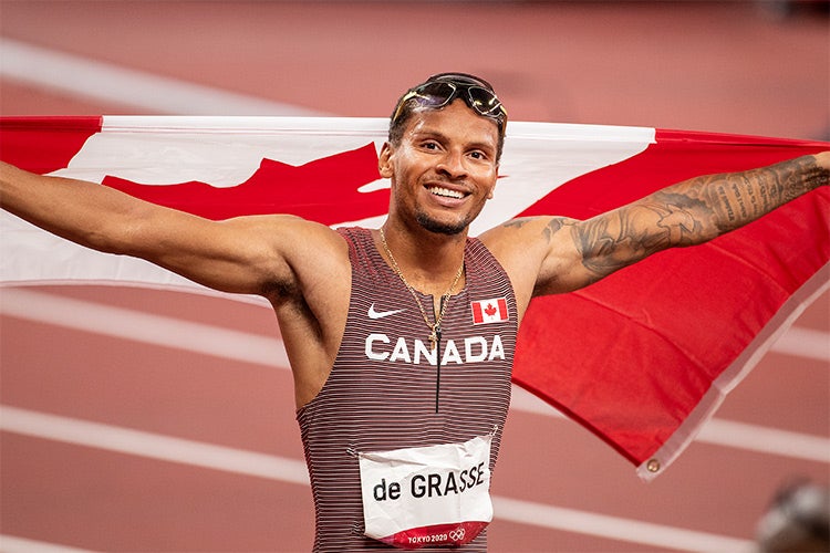 Andre De Grasse celebrates after winning the gold medal in the men’s 200-metre final at the 2020 Tokyo Olympics (photo by Tim Clayton/Corbis via Getty Images)