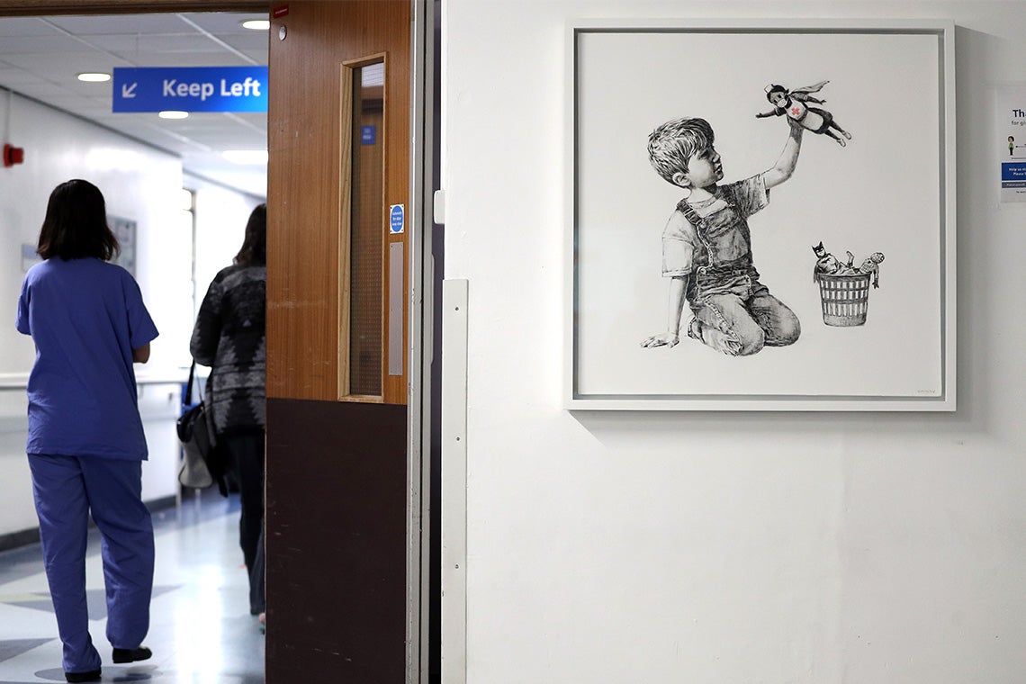 A person walks past a piece of Banksy's artwork displayed in a hospital in the United Kingdom during a COVID-19 lockdown (photo by Andrew Matthews/PA Images via Getty Images)