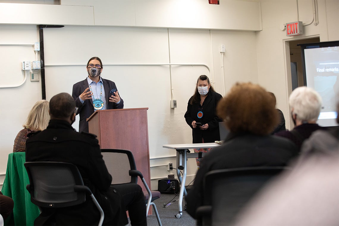 Michael White, director of First Nations House, speaks at the lectern while event organizer Jenny Blackbird, Indigenous Student Life co-ordinator, stands to his left (photo by Johnny Guatto)