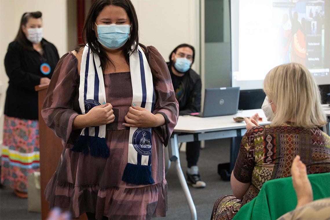 Elder-in-Residence Andrew Wesley began the graduation celebration with a smudging ceremony. Heather Kelly, executive director of Student Life programs and services, and Michael White, director of First Nations House, welcomed the attendees with opening remarks.