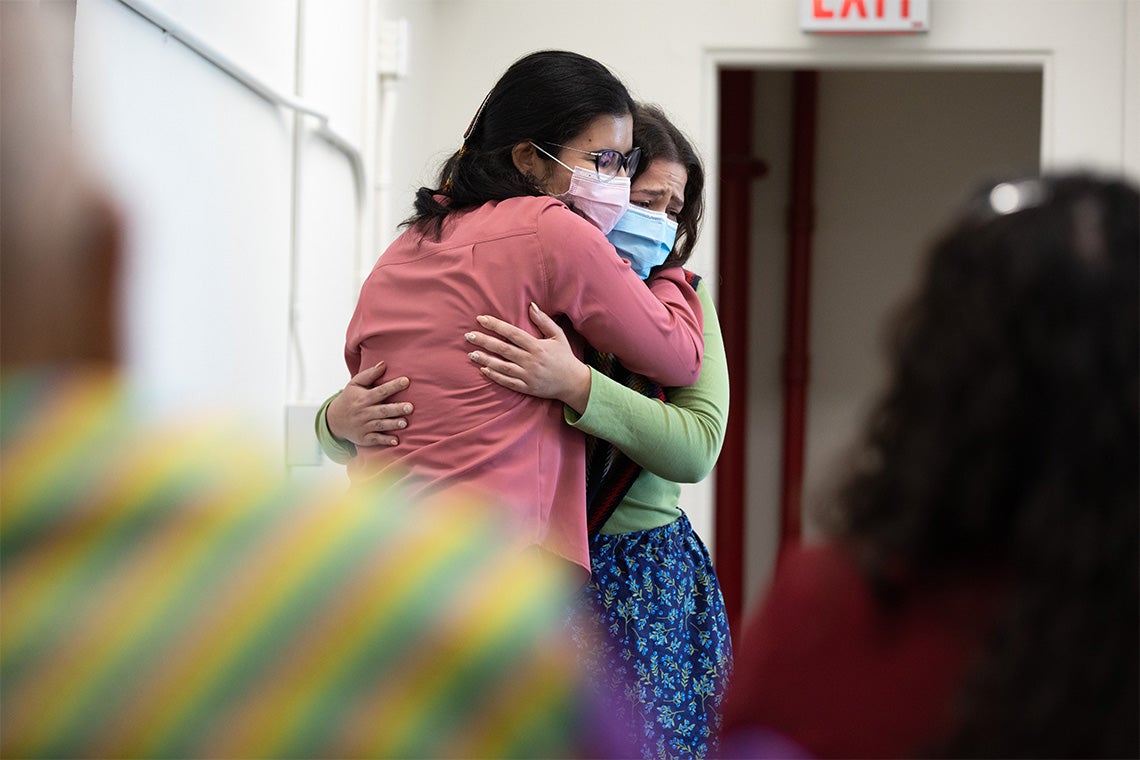 Friends Kristine Keon and Angelique Belcourt embrace during the Indigenous graduation celebration at First Nations House (photo by Johnny Guatto)