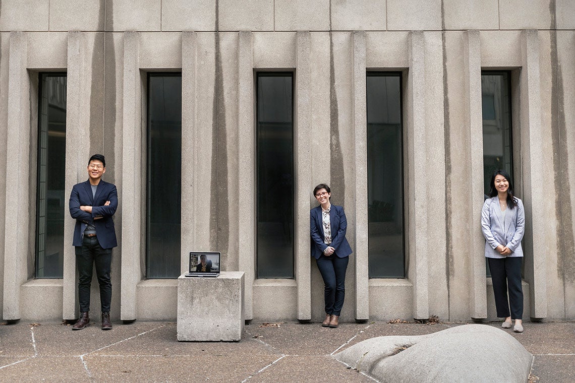 Medical students Daniel Lee, Orly Bogler (appearing via video conference), Jordynn Klein and Tingting Yan organized volunteers from their class and other programs to help front-line health-care workers during the COVID-19 crisis (photo by Nick Iwanyshyn)