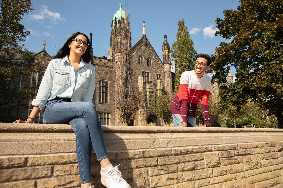 Friends and fellow Trinity College students Piya Sial (left) and Shashwat Aggarwal (right) completed their respective two-week quarantines – one floor apart – after returning to Toronto from India for the 2020 fall semester (photo by Johnny Guatto)