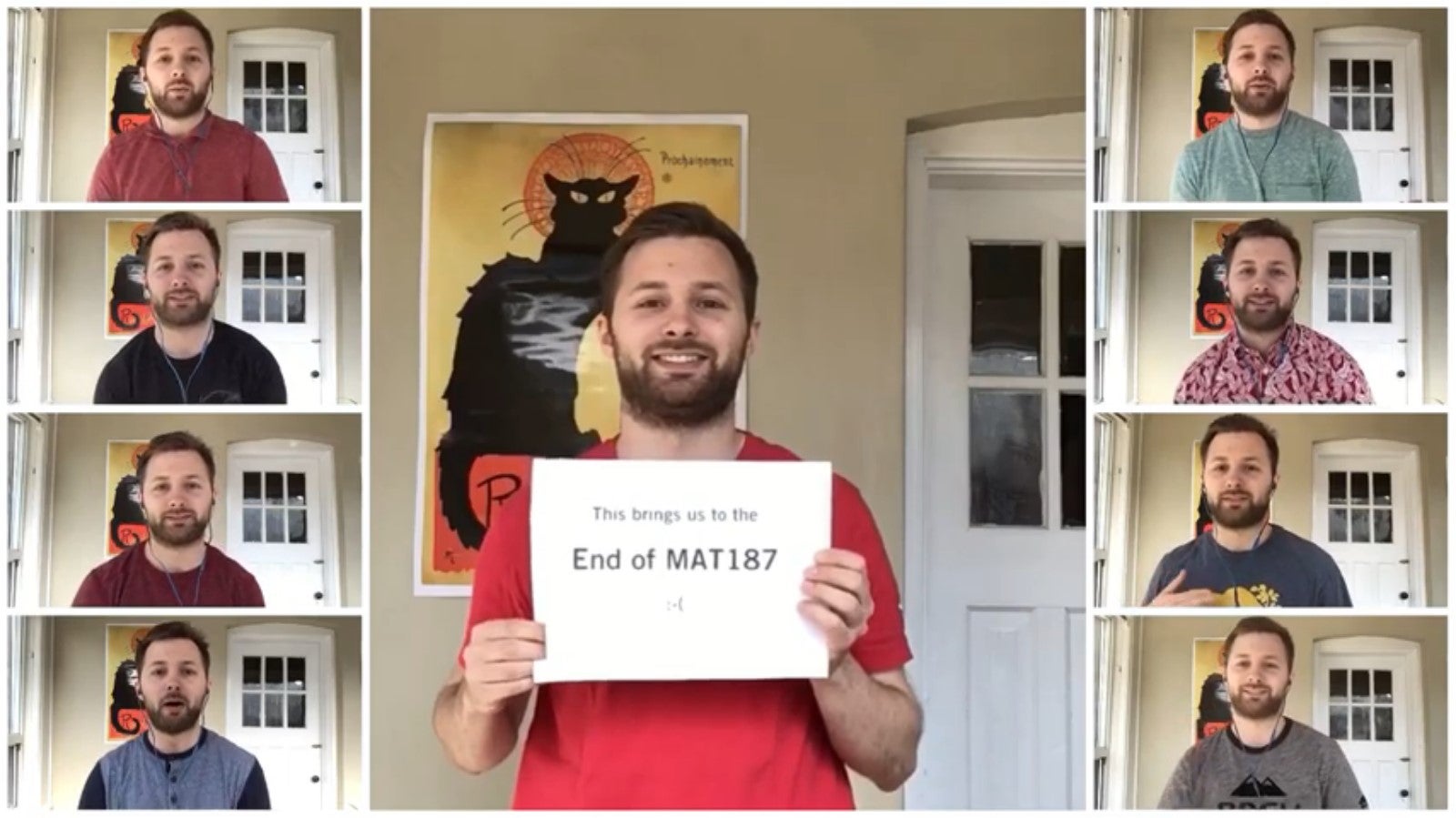 U of T Assistant Professor Fabian Parsch, who sings in a barbershop quartet, re-created the warmth of his classroom environment by saying goodbye to students at the end of term to the tune of “The Lion Sleeps Tonight” in a video performance (image via YouTube)