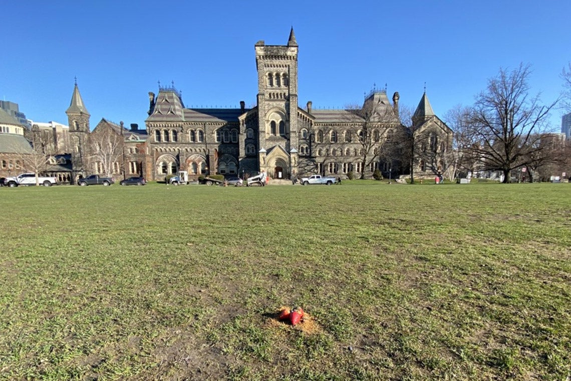 Prior to the work getting underway, leaders from U of T’s Indigenous community conducted a ceremony to acknowledge the impending changes to the land, which represents a direct connection to ancestors. As part of the ceremony, Shannon Simpson, director of Indigenous initiatives, and Michael White, director of First Nations House, Indigenous student service, made an offering of berries and tobacco.