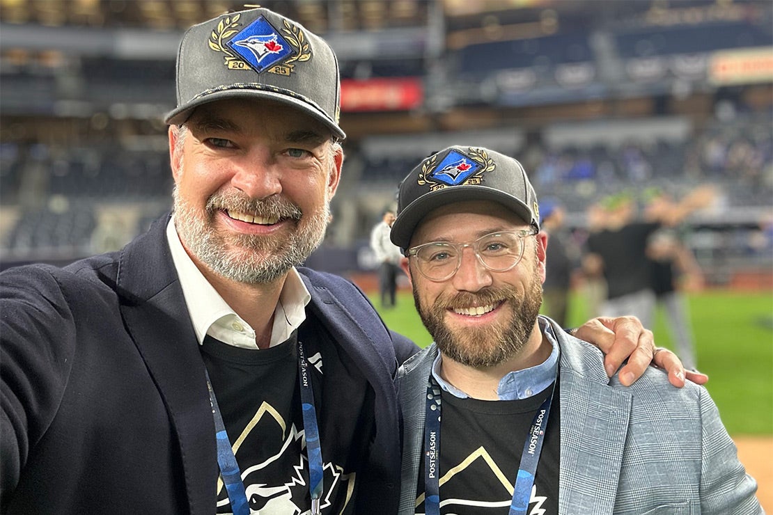 Toronto Blue Jays' lead primary care physician David Lawrence (right), who is medical director of U of T's David L. MacIntosh Sport Medicine Clinic and an assistant professor in the Temerty Faculty of Medicine, poses for a photo with team orthopaedic surgeon Jason Smith (left) at a Blue Jays game (photo courtesy of David Lawrence)