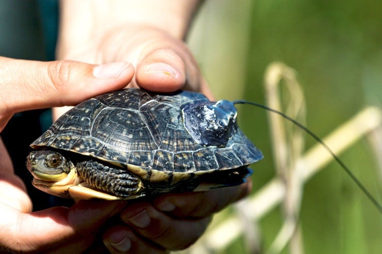 Blanding turtle outfitted with a small radio transmitter. Photo by Joren Romaniuk