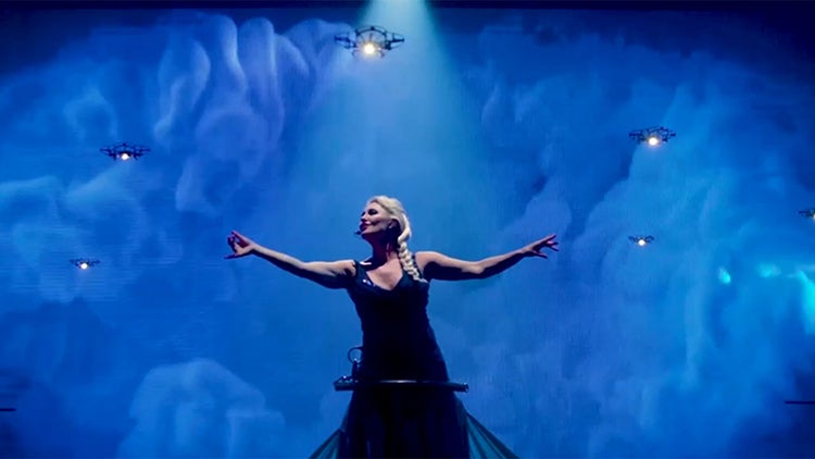 A singer performs onboard a cruise ship while a swarm of Lucie micro drones circle her (photo courtesy of Verity Studios)