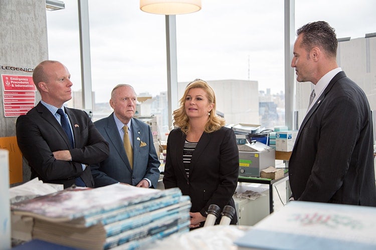 Kolinda Grabar-Kitarović was shown around the lab of Professor Igor Stagljar, a renowned researcher and biochemist at U of T. The purpose of her visit was to foster partnerships with the University of Zagreb and other Croatian institutions – a mission Stagljar shares.