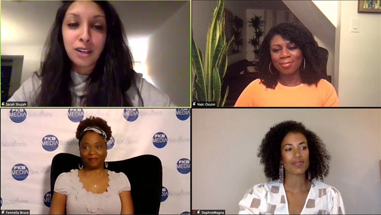 (Clockwise from top left) Sarah Shujah, Naki Osutei, Daphne Magna and Fennella Bruce participate in the Celebrating Leaders, Black Women in Business panel, organized by U of T Scarborough’s The Hub accelerator.