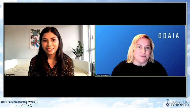 Following Rossi’s talk, it was on to the Scaleup Showcase and further inspiration and insights – this time, from the entrepreneurs behind 10 of U of T’s fastest-growing startups. Speakers included Nuha Siddiqui of plant-powered plastics startup Erthos (formerly Ecopackers); Helen Kontozopoulos of ODAIA, which developed an AI-powered customer analytics platform; and Albert Tai of Hypercare, a communication app for health-care professionals that has helped streamline care for COVID-19 patients.