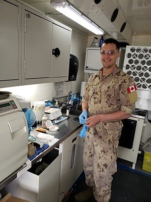 Jesse Barker in the Canadian Mobile Dental Clinic in Iraq (Photo by Sgt. Angela Brownell)Although Barker’s dad was a dentist, he didn’t consider a career in the field himself until he was finishing his degree in microbiology at the University of Saskatchewan. He says he liked the science focus in dentistry, especially prosthodontics, a branch of dentistry that deals with the design, fitting and manufacture of artificial replacements for teeth and other parts of the mouth.