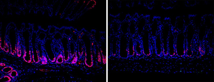 These images show the intestines of mice that have been given muramyl dipeptide (MDP) – left panel – and those that have not – right panel. The red stain marks cells that are proliferating, with more stain visible in the presence of MDP. A recent study showed that MDP acts via a receptor to spur intestinal stem cells to proliferate and generate new cells for lining repair (photo by Sabrina Coquenlorge-Gallon/Tae-Hee Kim lab, SickKids)