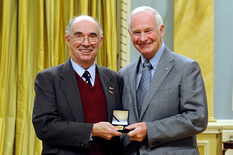 Former Governor General David Johnston (right) presented Morton with the Pierre Berton Award for teaching Canadian history in 2010 (photo by MCpl Dany Veillette/Rideau Hall)
