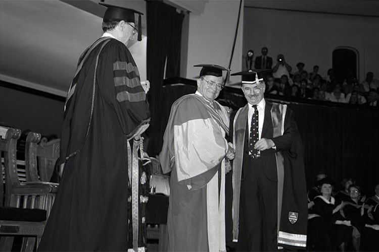Morton shakes hands with Ignat Kaneff as he receives an honorary degree (photo by Steve Jaunzems)