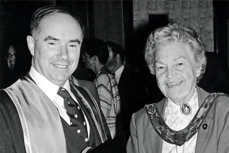 Former Mississauga Mayor Hazel McCallion with Morton at his installation as principal in 1986 (photo by Steve Jaunzems)