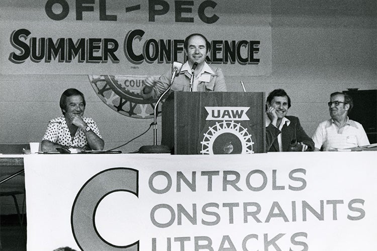Desmond Morton speaks at an Ontario Federation of Labour conference in the late 1980s or early 1990s (photo by Steve Jaunzems)