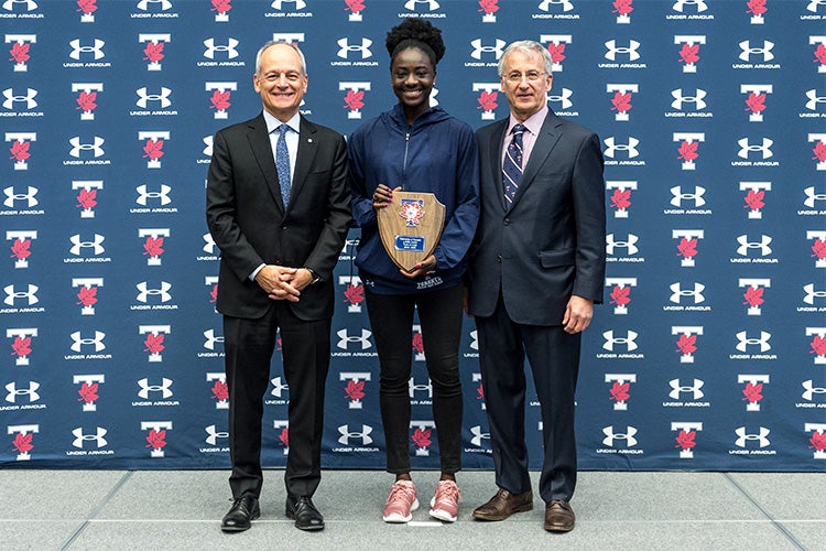 “The University of Toronto student athletes have donned the blue for over 140 years. They’ve represented U of T with determination, dedication and distinction and the group that we have gathered here today is no exception,” said President Gertler. “This past season has seen another bumper crop of individual and collective victories, personal bests and proud podium moments, giving our community so many reasons to cheer.
