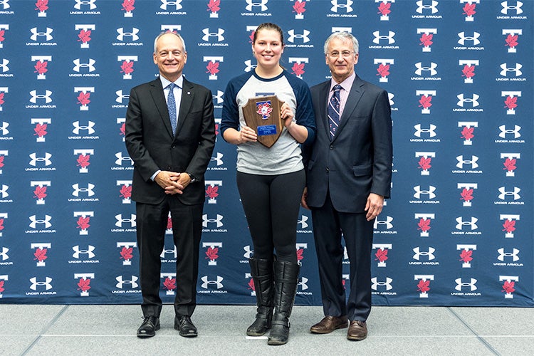 U of T President Meric Gertler and KPE Dean Ira Jacobs give Laura Amoi the Silver T award at the 2019 Varsity Blues President's Reception (photo by Seyran Mammadov)