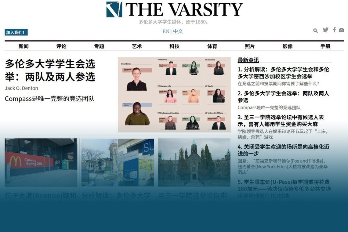 Following in the footsteps of major papers like the New York Times and Vancouver Sun, the University of Toronto's student-run campus newspaper, The Varsity, launched a Chinese-language website.