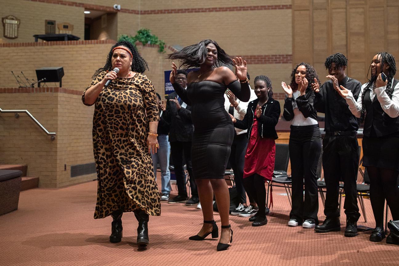 Abby-Gayle Isadora Allen dances beside Juno Award-winning singer Liberty Silver during the SEE UTM celebration and graduation (photo by Nick Iwanyshyn)