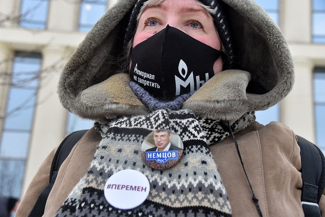 A woman wearing a face mask with the logo of Russia's rights group Memorial is seen outside the Moscow City Court where a hearing to dissolve the group's Human Rights Centre was taking place (photo by Vasily Maximov/AFP via Getty Images)