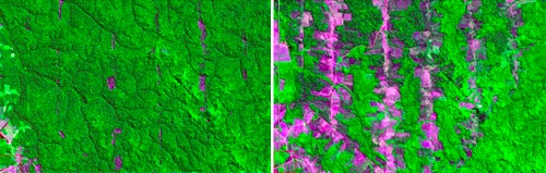 Landsat 8 satellite images showing the deforestation process in mature forest areas near the city of Belterra in the eastern Brazilian Amazon. The first image shows mature forests mainly intact in October 2018 and the second image shows pastures and other agricultural fields replacing the mature forests in October 2019.