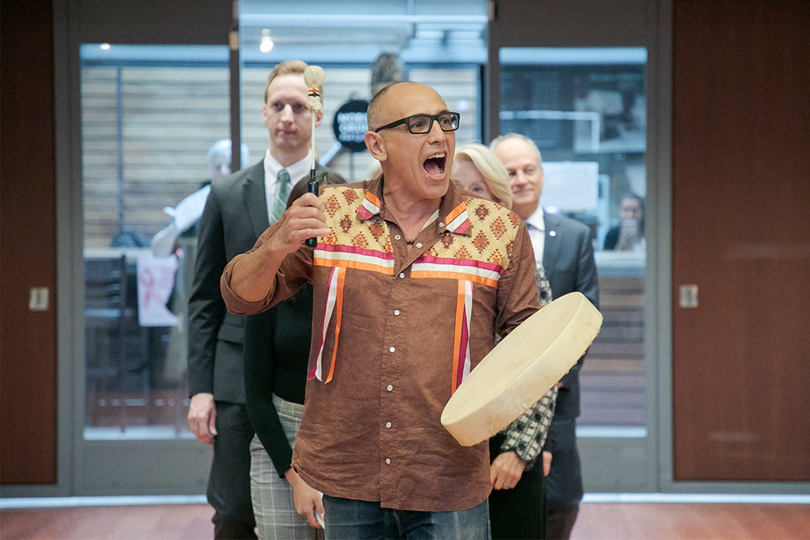 Archer Pechawis, a new media and performance artist, led the procession, which included President Meric Gertler and Chancellor Rose Patten, at Carol Chin’s installation ceremony on Wednesday (photo by Johnny Guatto)